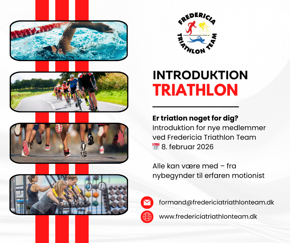 🎉 Intro-møde i Fredericia Triathlon Team – Kom og hør om triathlon! 🏊♂️🚴♀️🏃♂️ Er du nysgerrig på triatlon og overvejer, om sporten er noget for dig? Så kom med til vores Triatlon-dag og få en smagsprøve på, hvad triatlon handler om – helt gratis og uforpligtende! Læs mere HER