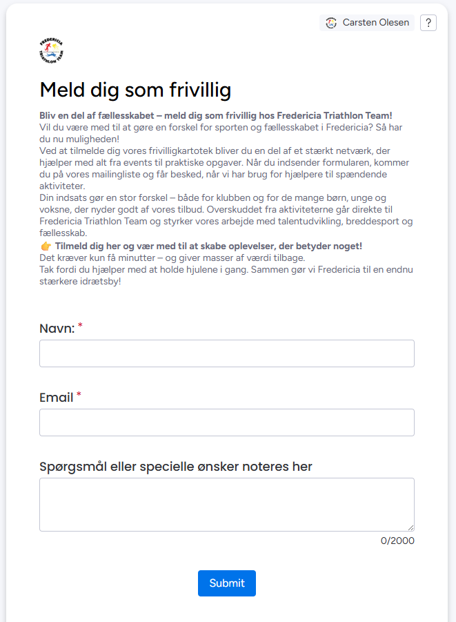 Ved at tilmelde dig vores frivilligkartotek bliver du en del af et stærkt netværk, der hjælper med alt fra events til praktiske opgaver. Når du indsender formularen, kommer du på vores mailingliste og får besked, når vi har brug for hjælpere til spændende aktiviteter.